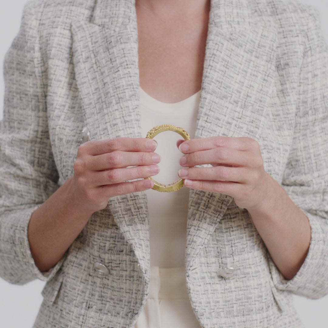 Every detail of this statement bangle is carefully considered, from the rustic raised bead borders to the floral focal points to its hollow body that allows for easy all-day wear.