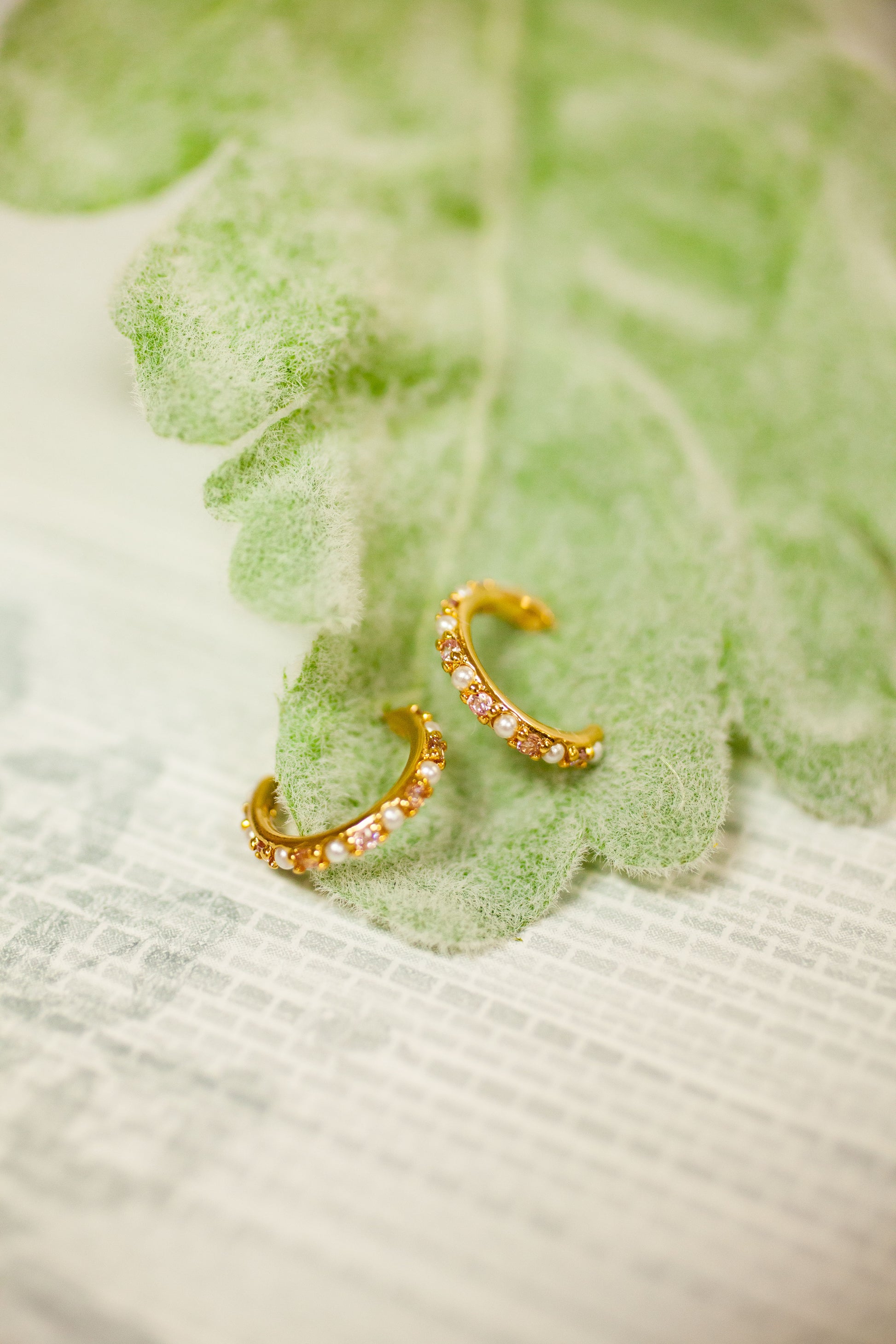 Joy petite hoop with hand set high quality CZ and pearl, Gold finish, Pink Tourmaline combo